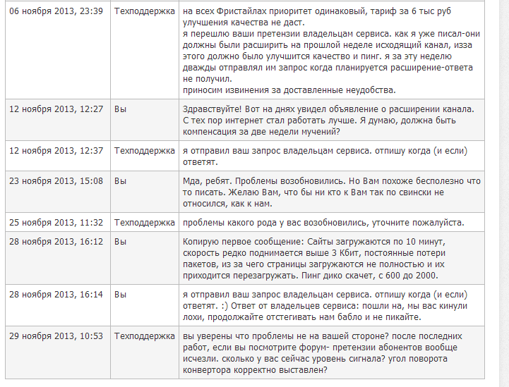 В октябре интернета 2 недели не было, на серфинг 3 плату сняли, компенсацию не сделали. И все отмазки, что владелец сервиса не отвечает.